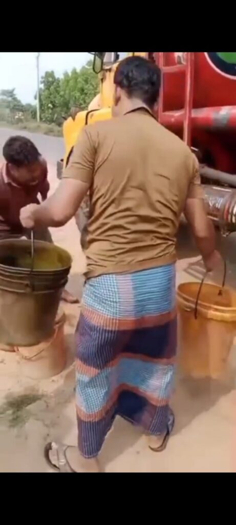 তেলবাহি ডিপোর ট্রাক থেকে বালতিতে করে তেল নিচ্ছেন একজন -কপোতাক্ষ