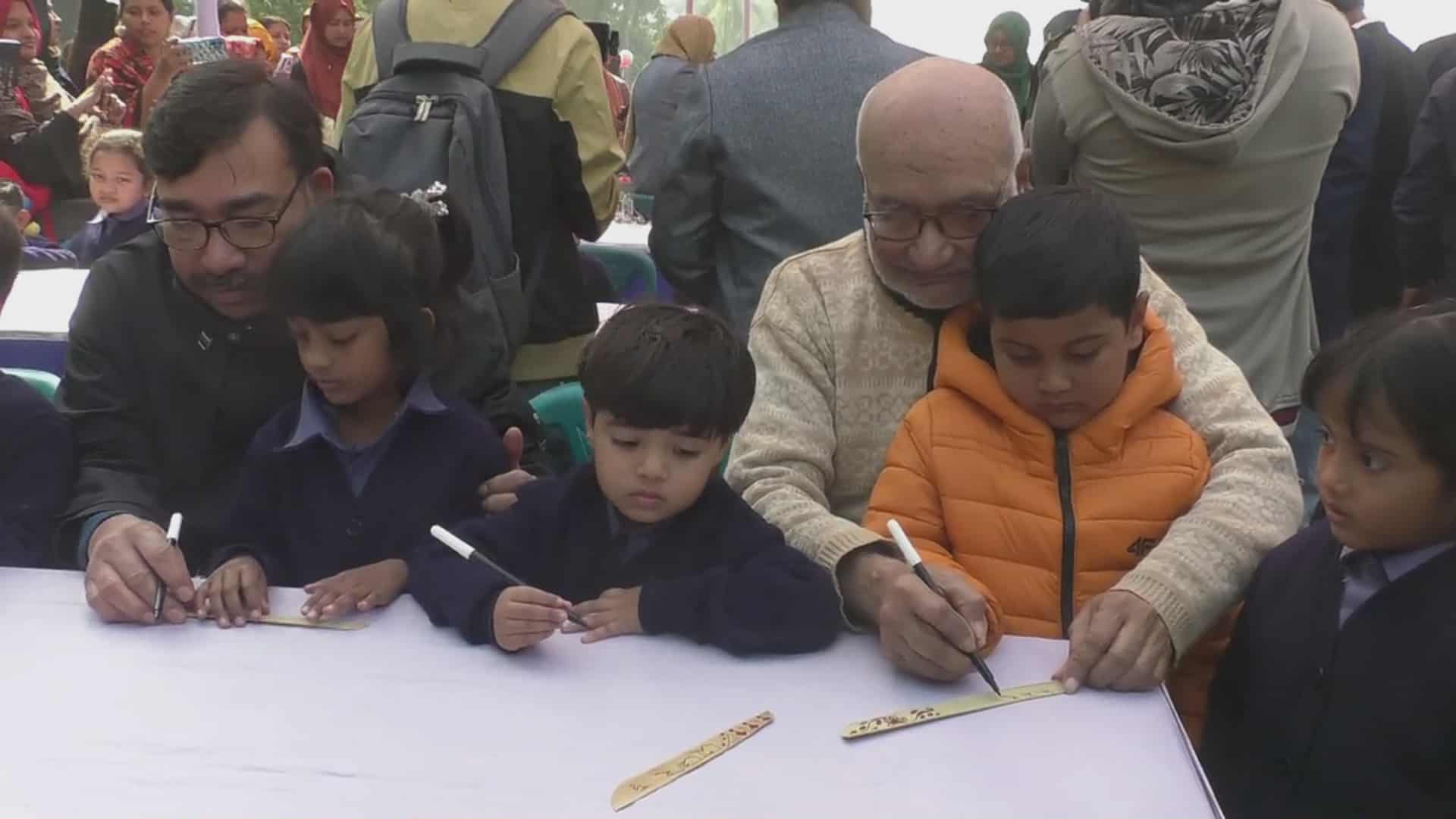 পৌষের মিষ্টি সকালে মা আর দাদির সাথে উদীচীর হাতেখড়ি উৎসবে এসেছে শিশু আদিয়াত ফাইয়াজ। তালপাতায় অ আ ক খ লেখার